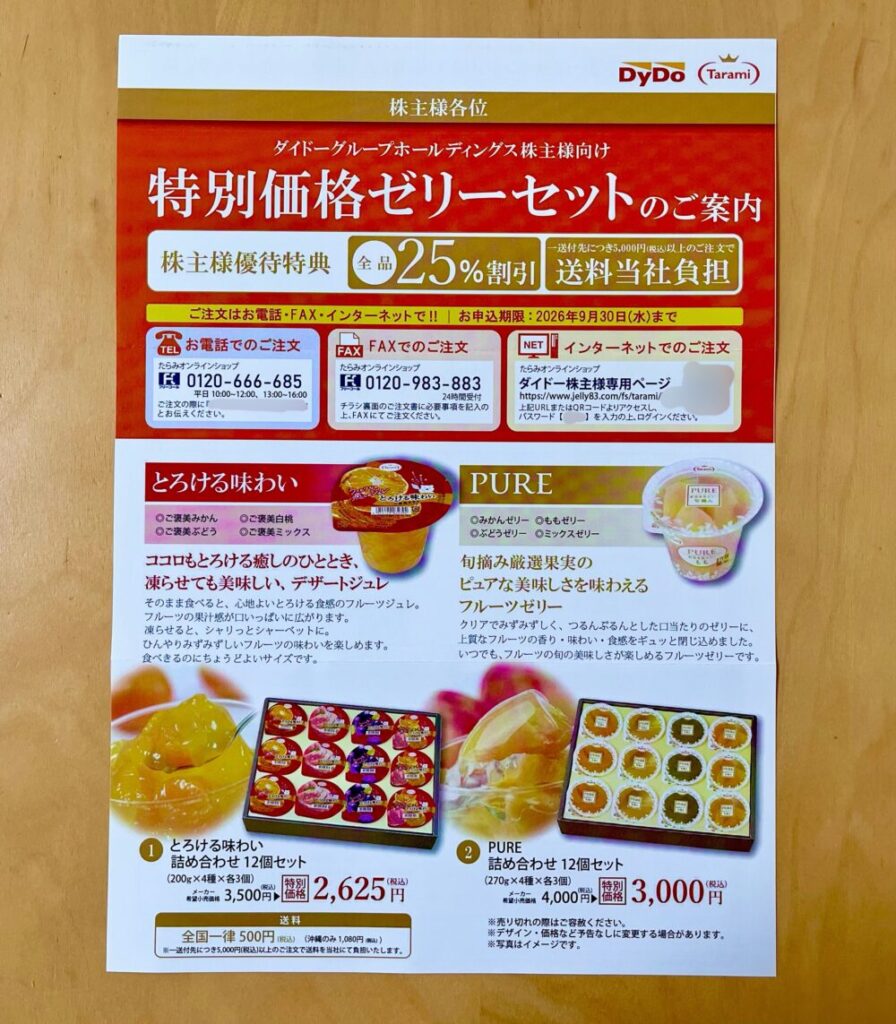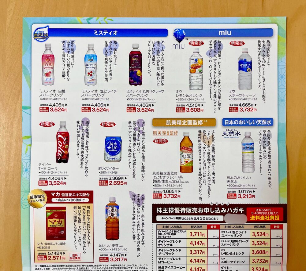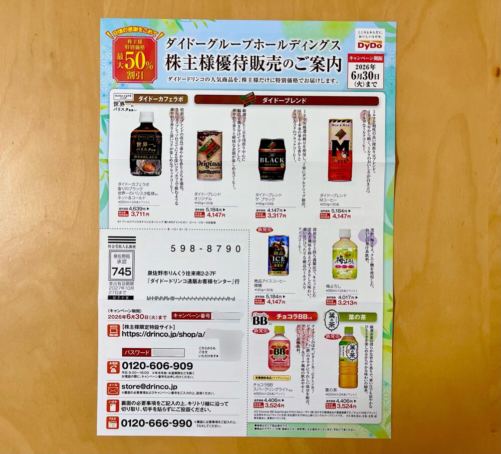 ここは1株優待企業でもあり、飲料などグループ商品の優待販売の案内ももらえます。
