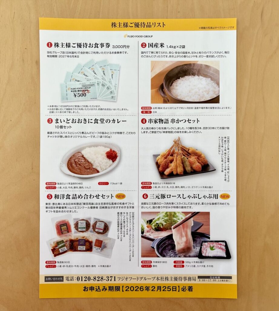 自社PB商品 または 株主様優待食事券がもらえるフジオフードグループ本社の株主優待を紹介します。