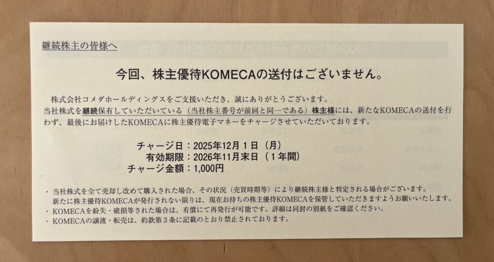 KOMECAは次回以降の株主優待も同じカードに自動チャージされます。