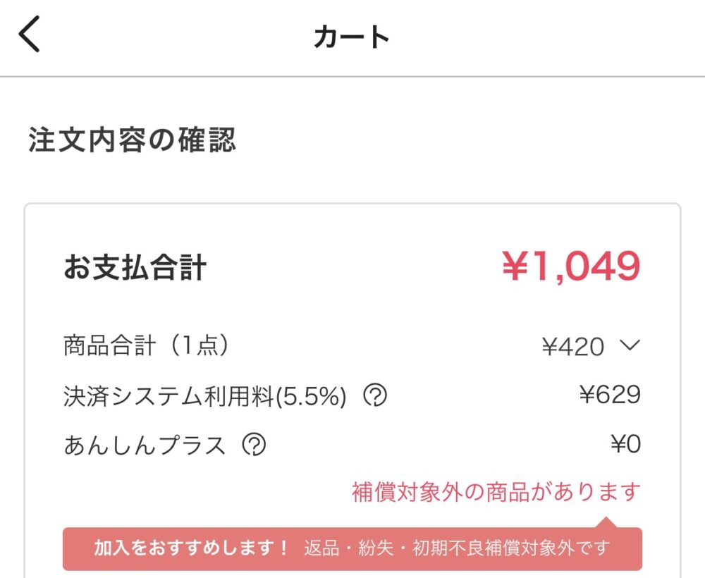 初期設定では付加されていて、外すこともできる「あんしんプラス」は商品価格の1.47%(税込)で、商品価格が2万円以下の場合は一律293円(税込)もかかるという…