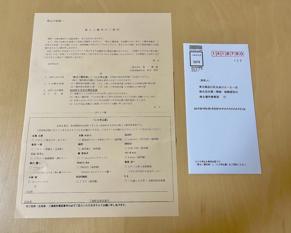 カラオケビッグエコーなどで使える優待券がもらえる、第一興商の株主優待を紹介します。