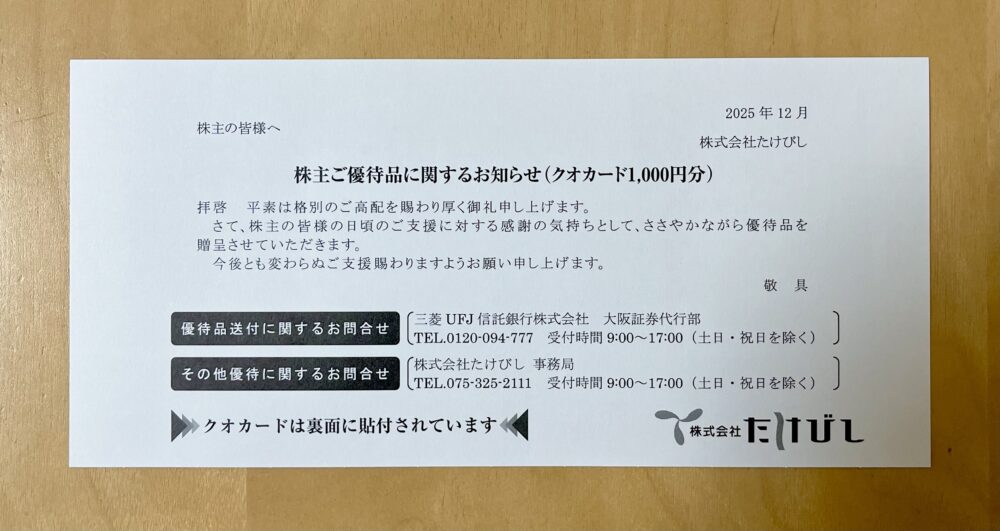 クオカードがもらえる、たけびしの株主優待を紹介します。