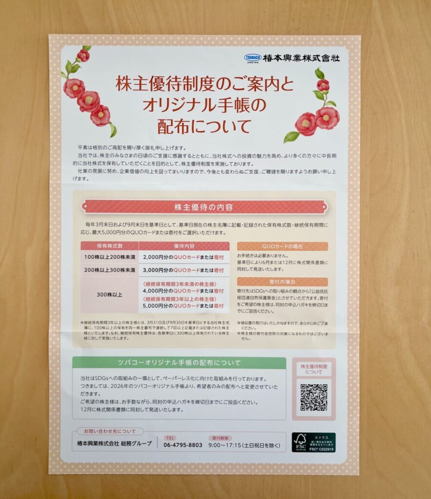 クオカードがもらえる、椿本興業の株主優待を紹介します。
