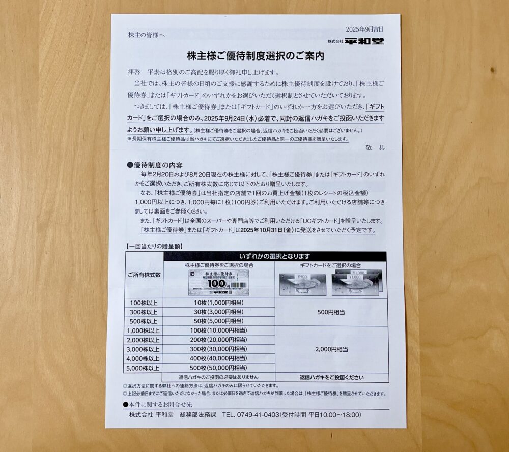 優待券またはギフト券が選べる平和堂の株主優待を紹介します。